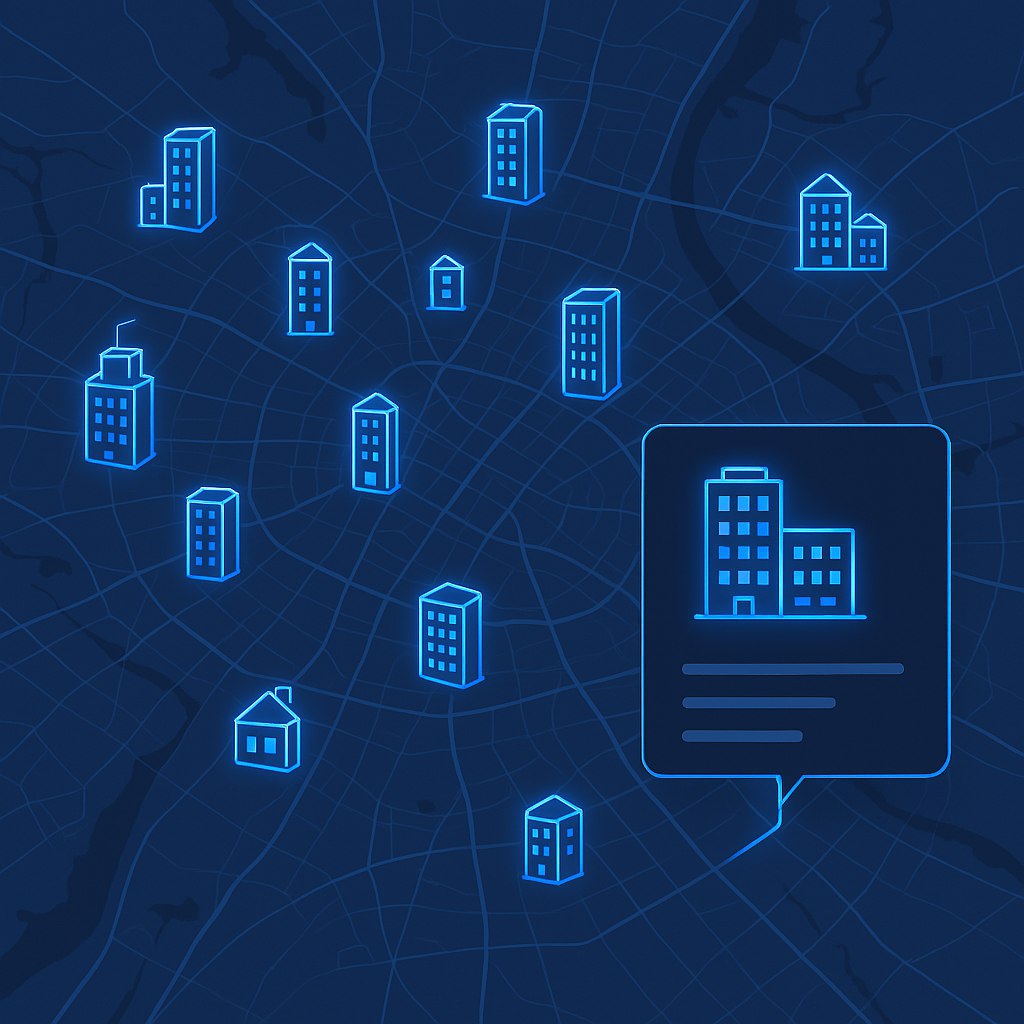 Географічна візуалізація всіх підключених об'єктів з можливістю швидкого доступу до детальної інформації про кожну будівлю в один клік.
